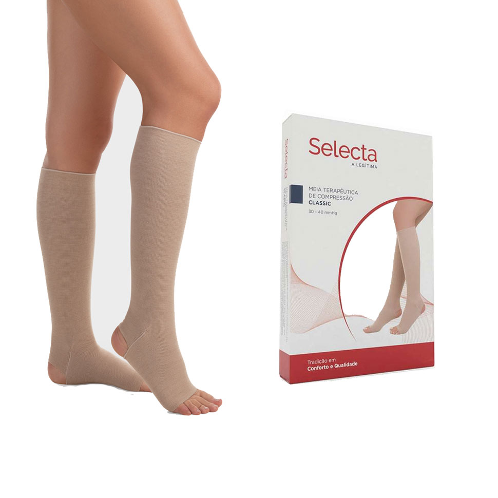 A meia de compressão 30-40 mmHg AD 3/4 selecta é recomendada para o tratamento de pós-escleroterapia ou operação de varizes, varizes com tendência a edema, flebotrombose aguda (superficial ou profunda), tratamento para varizes e/ou edemas durante a gravidez, linfedema, auxiliar na cicatrização de úlceras venosas, insuficiência venosa dos membros inferiores.